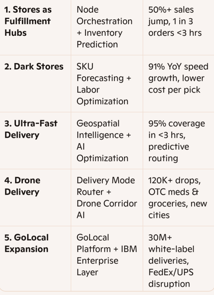 The company’s strategy is powered by a 9‑layer delivery infrastructure that blends geospatial intelligence, predictive inventory, drone routing, and white‑label fulfillment.